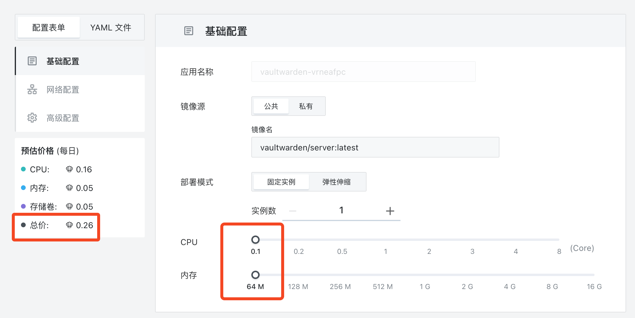 模板默认使用的 CPU 是 0.2C,内存是 256M,不过 Vaultwarden 只需要 10M 就能跑起来,个人使用完全不需要这么多内存,咱们直接把 CPU 和内存调到最低: