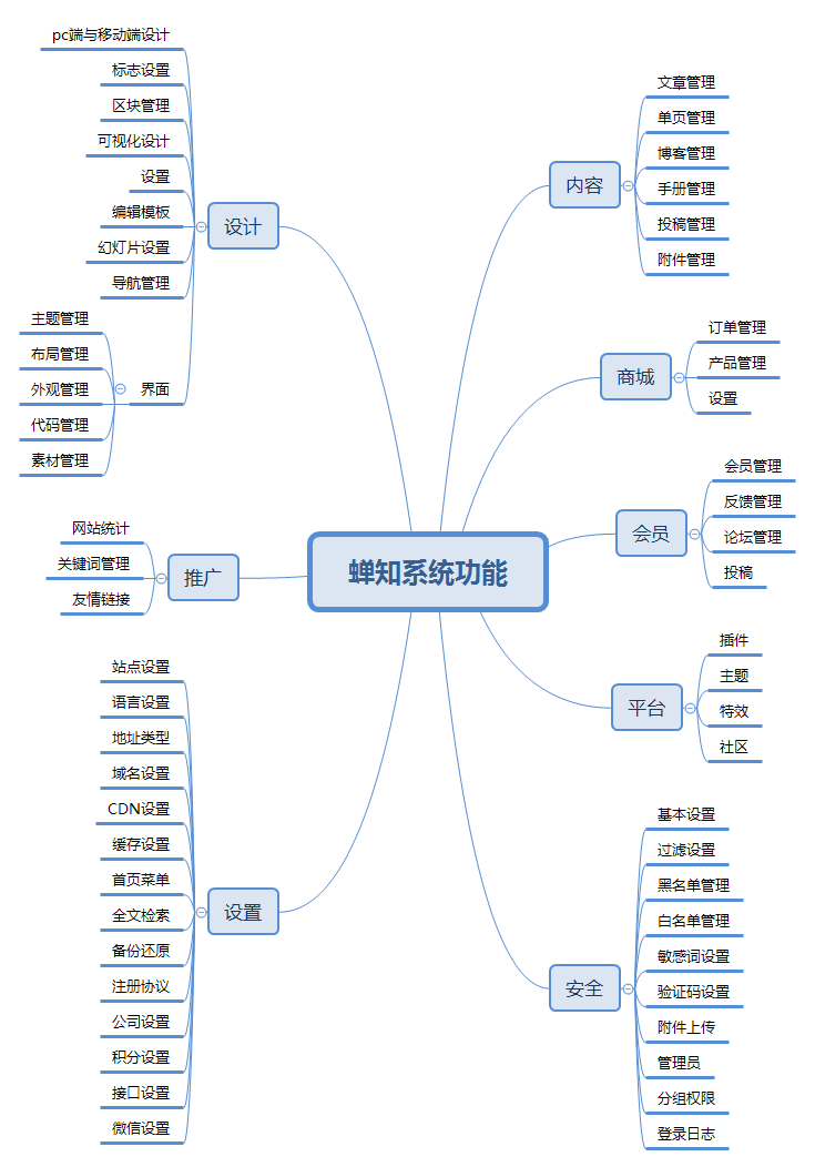 蝉知系统是13年开发的一款“年轻的”的企业建站系统,与其他CMS系统相比,蝉知是目前国内少用的专注企业营销的门户系统。系统集合了文章内容、产品商城、论坛、博客、微信、多终端、多语言等功能。利于SEO,便于扩展,熟悉html/css/js的用户可以通过区块机制自定义布局设计界面。但目前而言,蝉知系统提供的主题、插件较少。