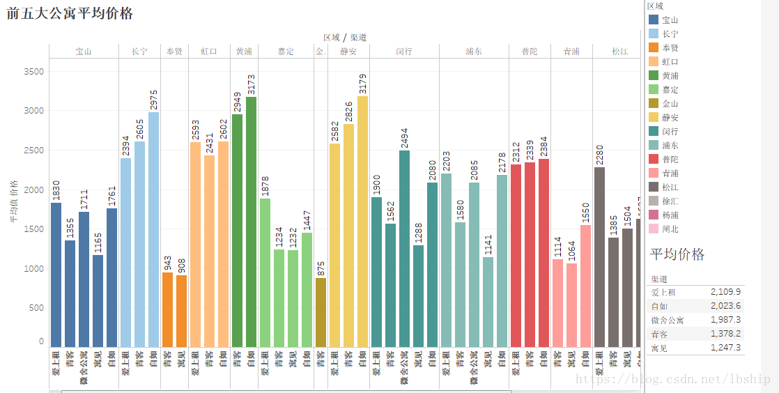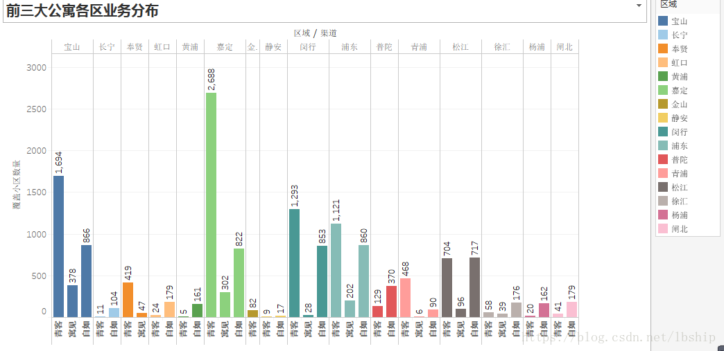 利用tableau工具画图,来看看前三大公寓在各区的业务开展情况: