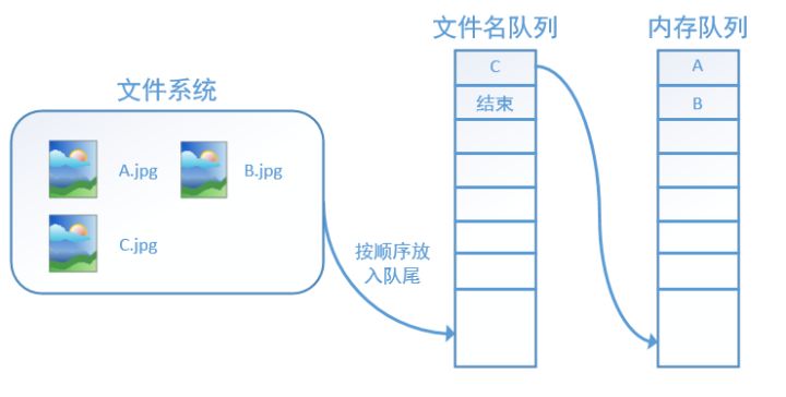 程序运行后,内存队列首先读入A(此时A从文件名队列中出队):