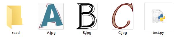 我们用一个具体的例子感受tensorflow中的数据读取。如图,假设我们在当前文件夹中已经有A.jpg、B.jpg、C.jpg三张图片,我们希望读取这三张图片5个epoch并且把读取的结果重新存到read文件夹中。