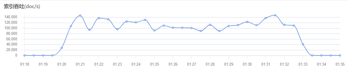 我们先看看不做限制的时候,测试环境的写入速度,在 9w - 15w docs/s 之间波动。虽然峰值很高,但不稳定。