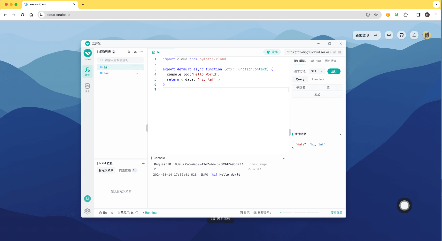 如图,我们把 Laf 融合到 Sealos 中去了,大家现在可以在 Sealos Desktop 创建和开发 Laf 应用,最新版的 Sealos 已内置了云开发能力,开箱即用 (包括私有化部署的 Sealos),正式命名为 Sealos 云开发。