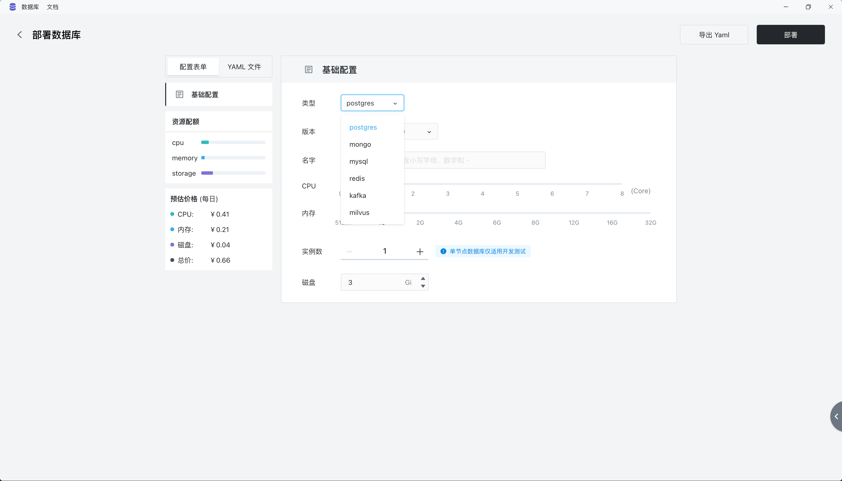 更多的数据库:过去的 Laf 提供的云数据库只有 MongoDb,现在可以根据业务需要在 Sealos 选择很多种主流数据库,当前支持 PostgreSQL、MongoDb、MySQL、Redis、Kafka、ElasticSearch 等,未来还会支持更多种类的数据库、中间件。