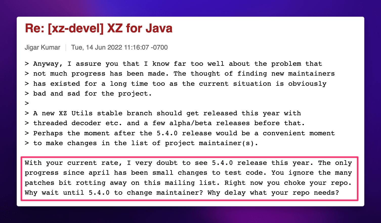 就在这时,一个名叫 Jia Tan 的开发者出现在 Lasse 面前,表示愿意帮助维护项目。Jia Tan 在私下里也给了 Lasse 不少支持和鼓励。“太好了,终于有人能分担一些工作了。” Lasse 心里的石头落了地。