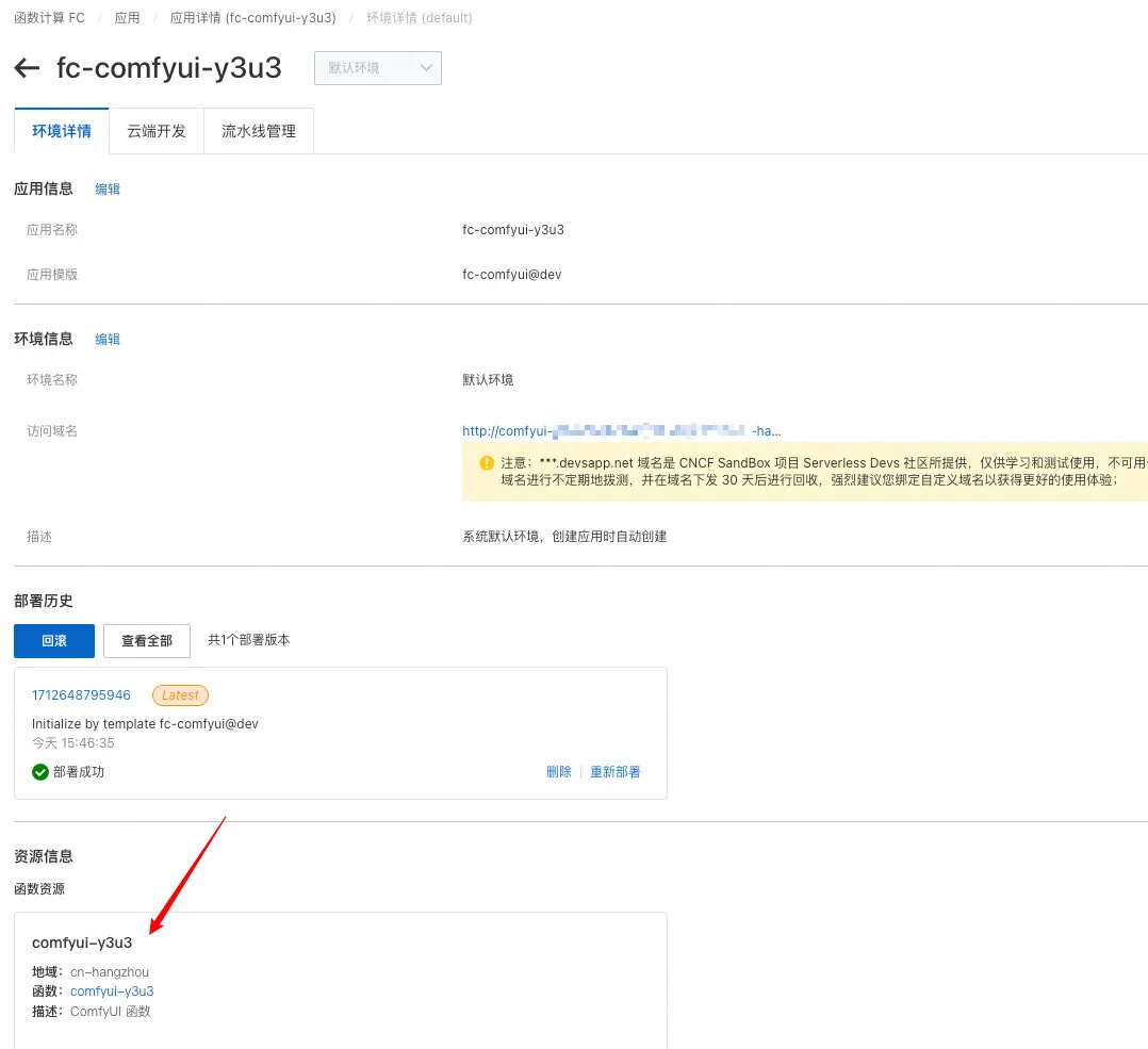 进入函数计算控制台:通过应用详情,跳转到函数控制台