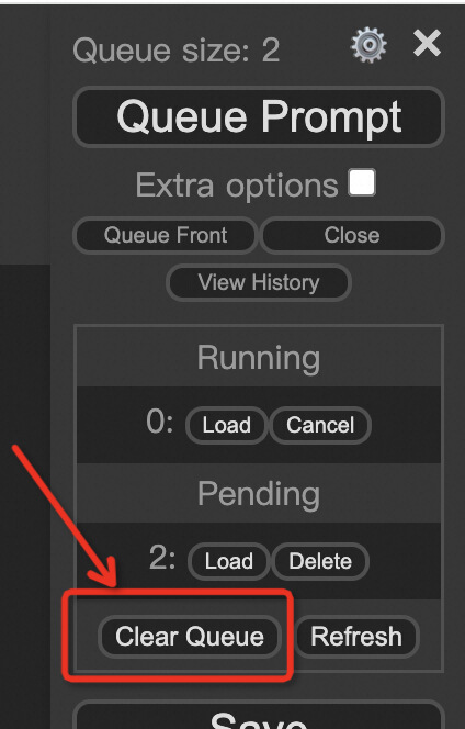 A2: 点击 View Queue-Clear Queue, 可删除目前排队,如果您遇到出图时间过久,排队过多的情况可以通过清楚队列,Refresh 来解决