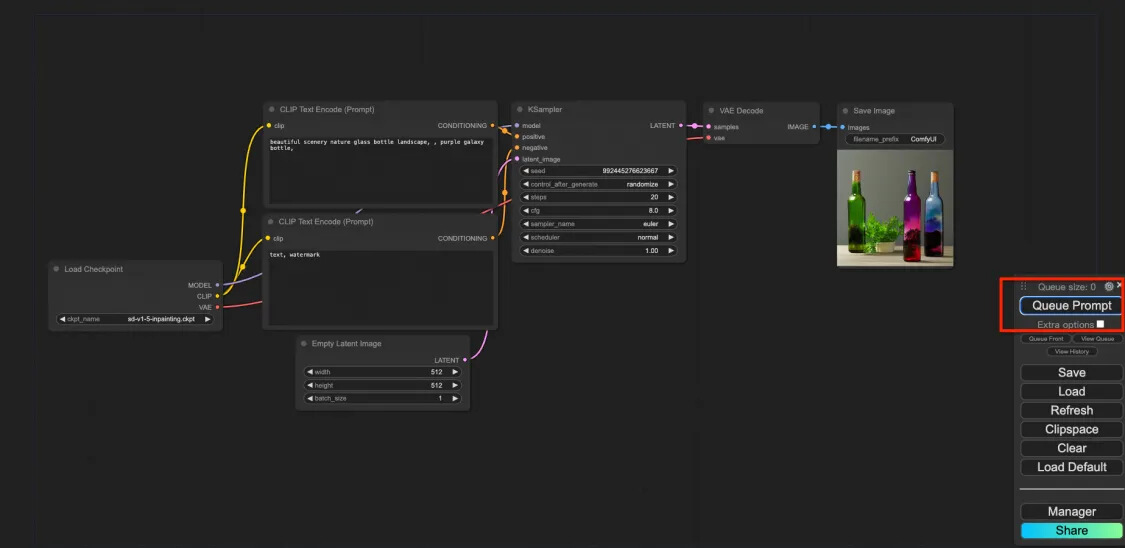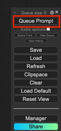 提供 默认工作流,点击 Queue Prompt ,测试制作自己的第一张图。第一张图的出图时间大概需要 15秒,后续出图时间大概3秒左右