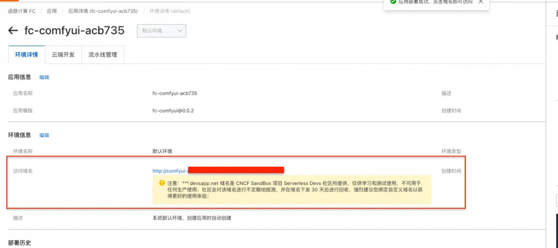 请注意:***.devsapp.net 域名是 CNCF SandBox 项目 Serverless Devs 社区所提供,仅供学习和测试使用,不可用于任何生产使用;但是社区会对该域名进行不定期地拨测,并在域名下发 30 天后进行回收.建议您后续绑定自定义域名以获得更好的使用体验,或者重新部署一次 应用,重新挂载 NAS就可以了