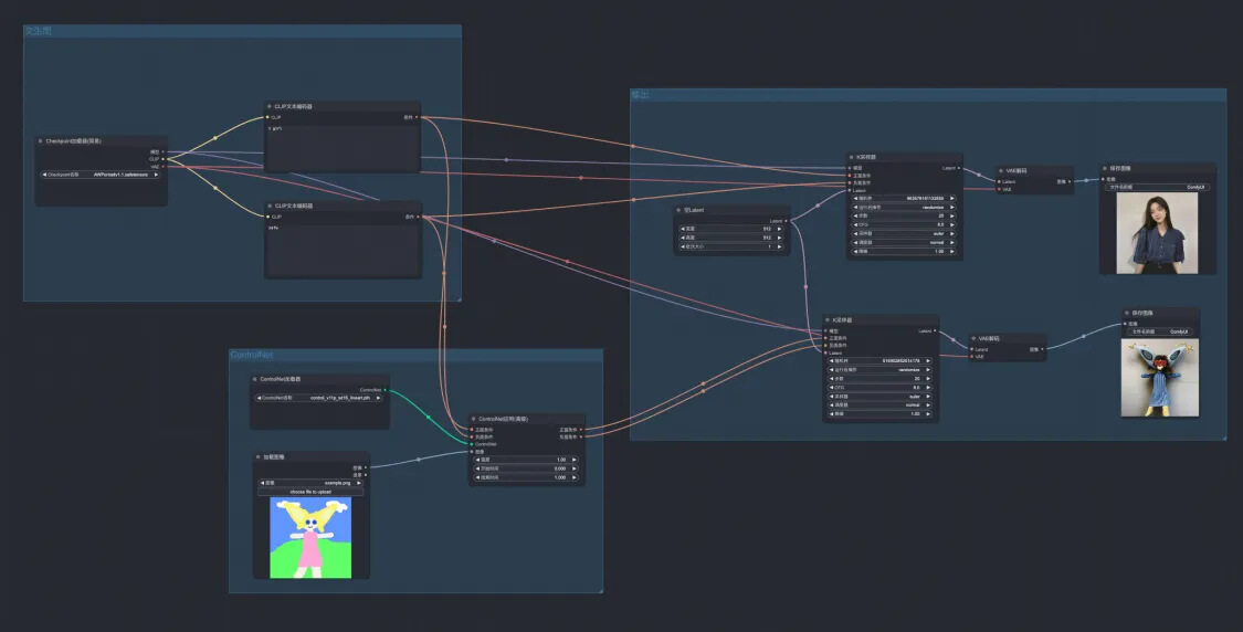展示了使用 ControlNet 对比直接输出的差异,提供了工作流 JSON 示例以及对应模型的下载说明。