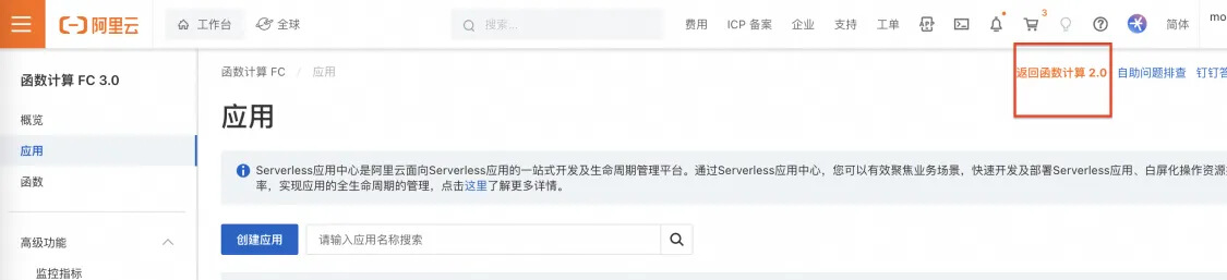 进入函数计算控制台 - 应用中心, 进入 函数计算 3.0(如右上角“返回函数计算 2.0”即为进入了函数计算3.0控制台)