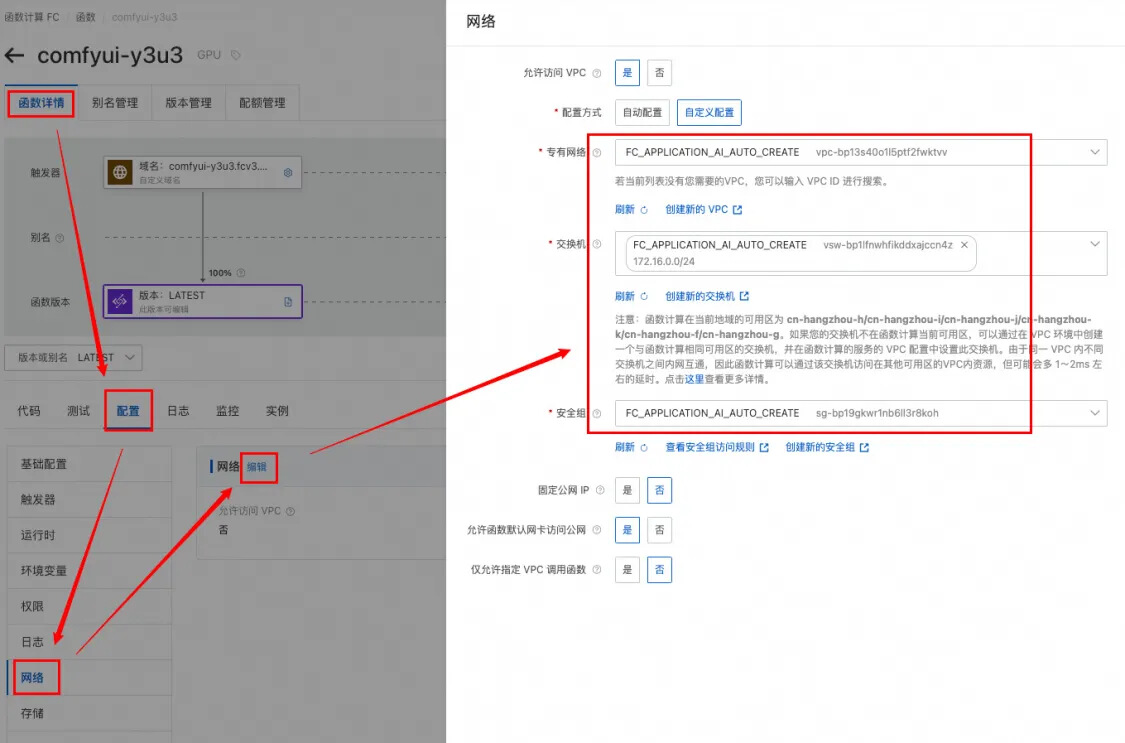 为了方便自定义模型和节点,您需先绑定文件管理 NAS。通过函数控制台的网络配置,绑定专有网络/交换机。若无相关资源,需先创建。