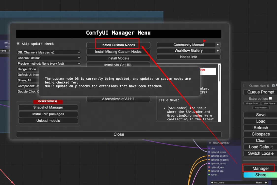 导入第三方的工作流,可能会遇到节点不存在的报错,可以借助 ComfyUI Manager 安装缺失的节点