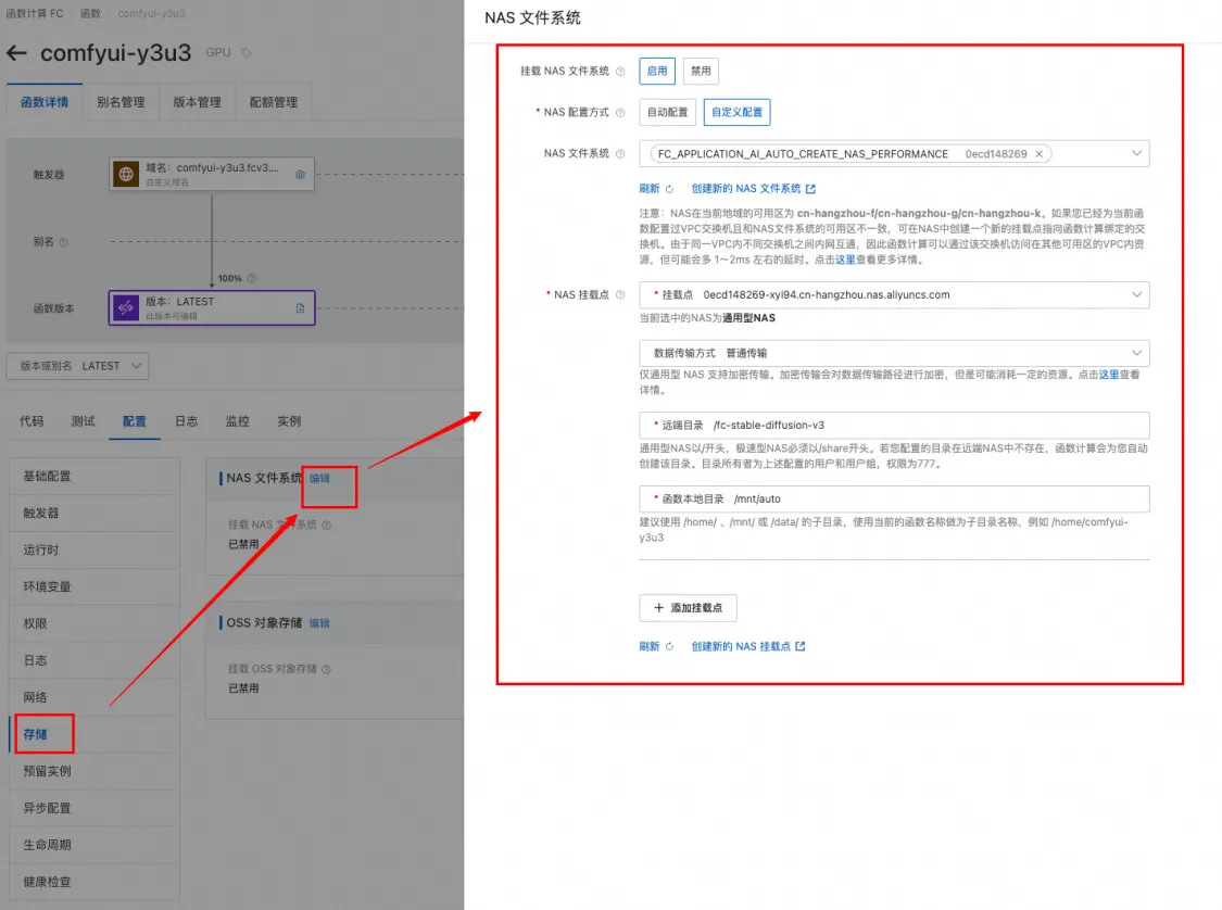 NAS 挂载:进行 NAS 挂载设置,绑定对应专有网络、交换机下存在的 NAS 挂载点。 函数本地目录请填写 /mnt/auto 或 /mnt/auto/comfyui;如果您曾经在当前 NAS 中使用过 Stable Diffusion 应用,可以考虑将远端目录设置为 /fc-stable-diffusion-plus,本地目录设置为 /mnt/auto。 大模型对文件 IO 要求较高,建议创建 通用性能型 NAS 实例,NAS 会根据存储的文件大小进行计费,不通规格的 NAS 计费单价不一致,请参考相关文档。