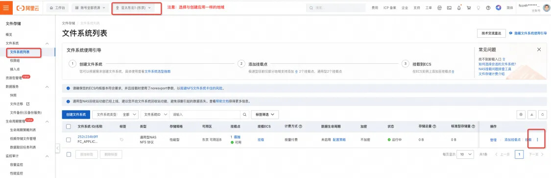 进入文件存储 NAS控制中心,选择 文件系统列表-选择地域-