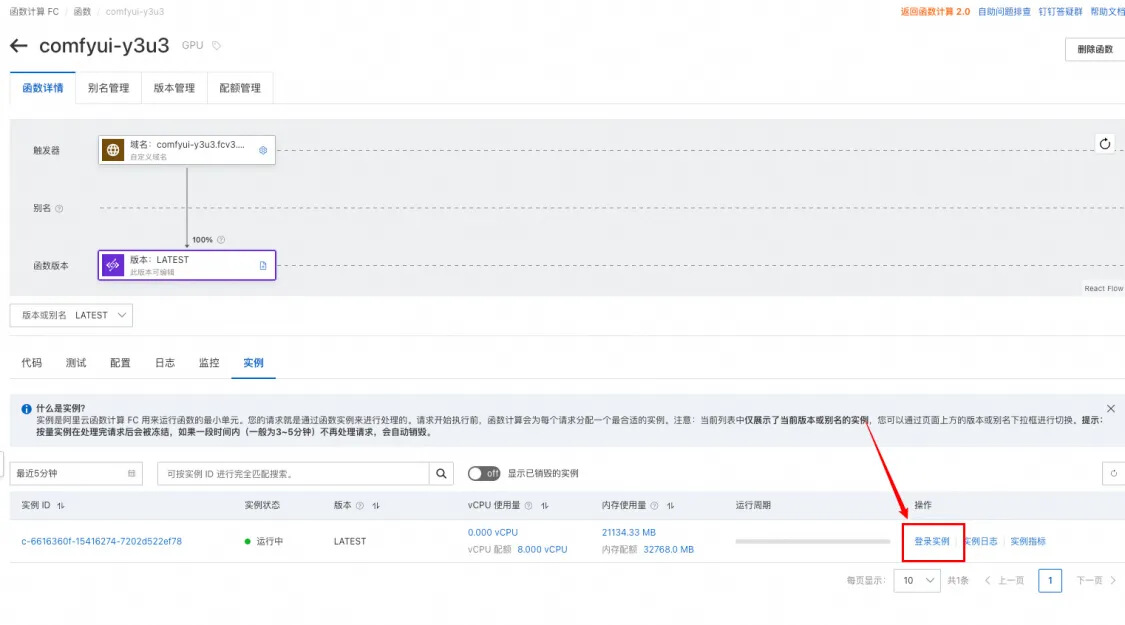 函数计算支持登入运行中的函数实例,您可以在终端中执行需要的操作(如手动安装自定义节点、依赖等)
