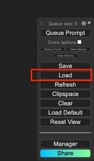 2.点击 Load 将下载好的 json 文件 导入 ComfyUI