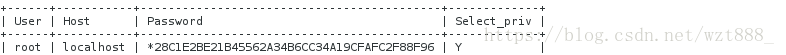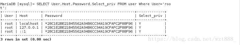 <4>SELECT User,Host,Password,Select_priv FROM user Where User='root'; #从root用户的User中查询
