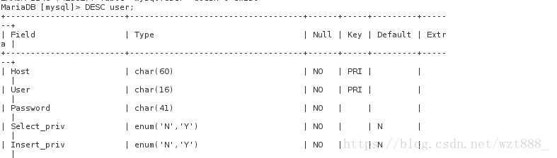 <5>SELECT User,Host,Password,Select_priv FROM user Where User='root' AND host='localhost'; #查询user表的数据结构