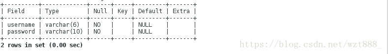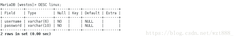 -> password varchar(10) not null);#新建数据库westos中的表格linux