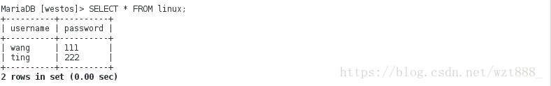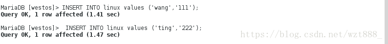 <6>INSERT INTO linux values ('wang','111'); #在linux表格中插入信息