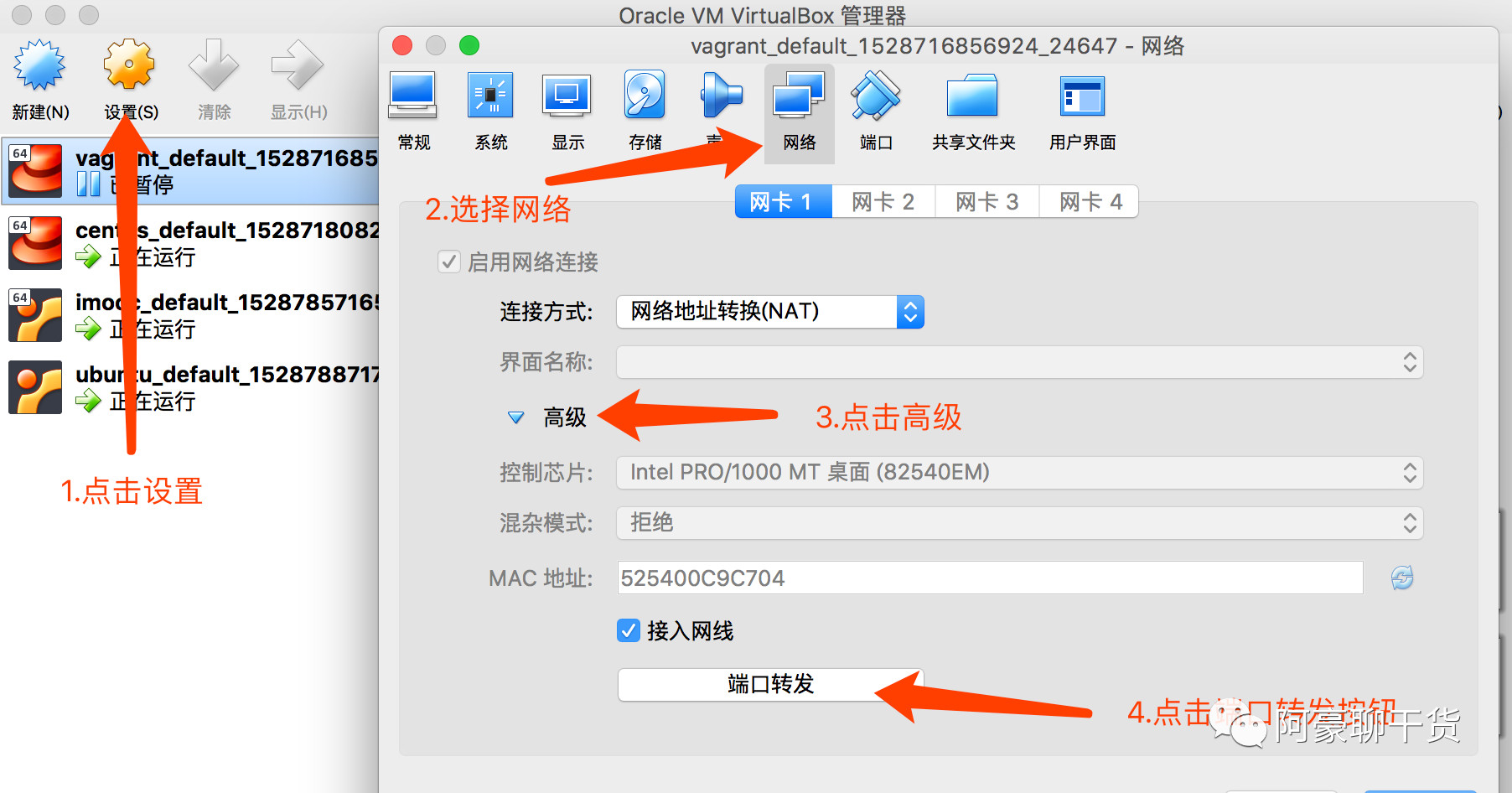 是指将宿主计算机的端口映射到虚拟机上的某个端口上,访问宿主计算机的该端口时,请求实际会被转发到虚拟机上指定的端口,配置文件设置语法为: