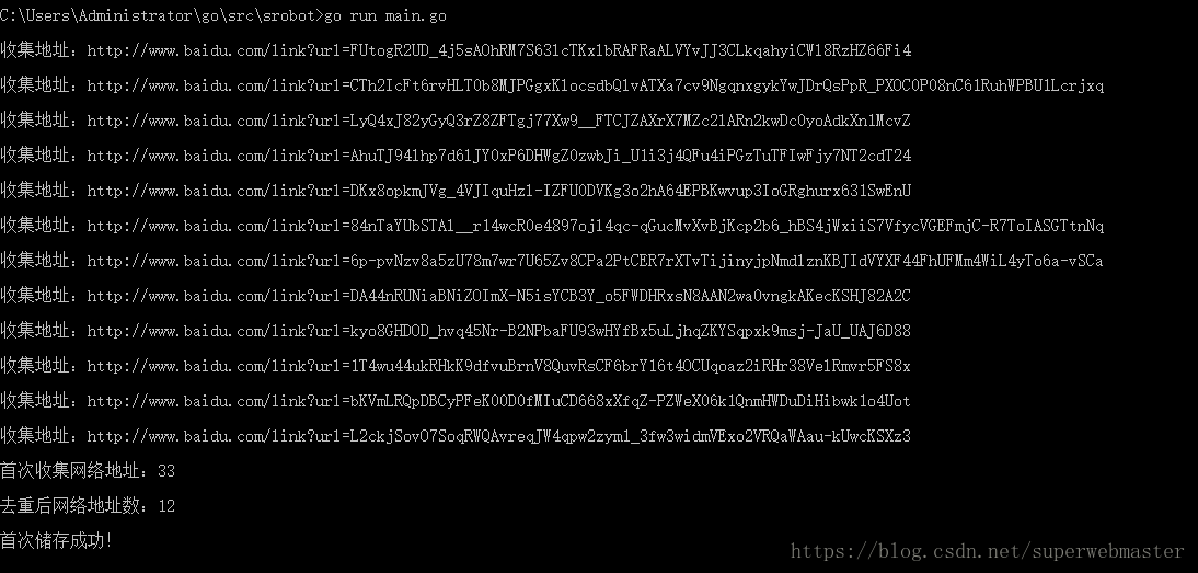 func checkRegexp(cont string, reg string, style int) (result interface{}) { check := regexp.MustCompile(reg) switch style { case 0: result = check.FindString(cont) case 1: result = check.FindAllString(cont, -1) default: result = check.FindAll([]byte(cont), -1) } return }这里,程序的首次执行已经完成,并可以成功记录爬取的链接了。程序执行如下: