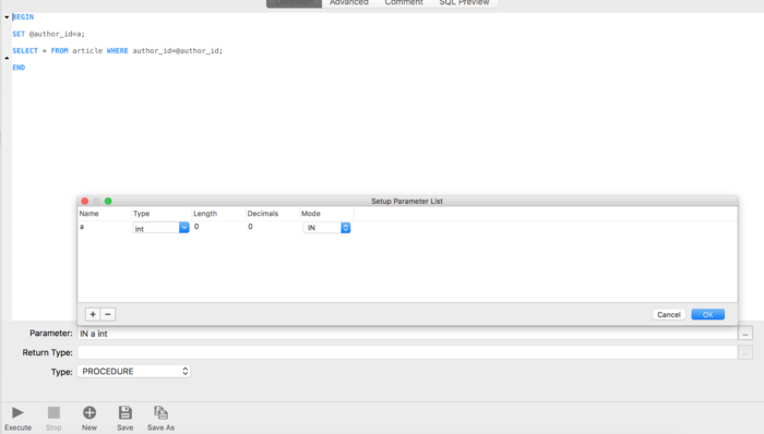 打开数据库管理工具,选择要创建存储过程的数据库,然后选择'Functions'这个菜单,界面如上图所示 **,存储过程写好之后,如果要传入参数或者输出,点击‘Parameter’右边的‘···’弹窗如上图,输入参数名,然后选择参数类型,长度以及最后的Model,Model有三个值:IN、OUT、INTOUT,这三个值在上面已经说明了。添加多个参数,点击‘+’即可,如果要删除参数,选中要删除的参数,然后点击‘-’即可删除。