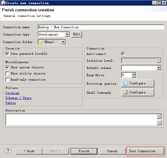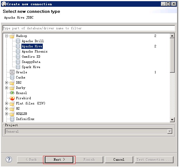 首先新建一个连接(可以看到支持的数据库非常多),选择Apache Hive,点击下一步。