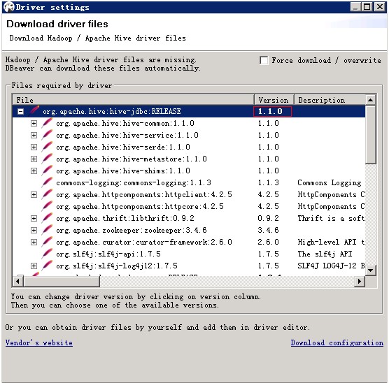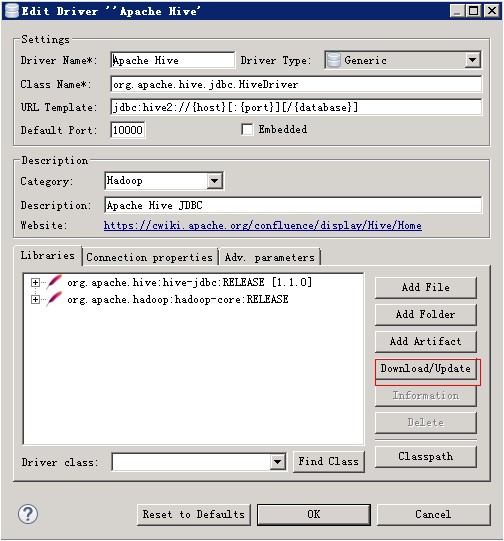 在这里一定要选择与自己hive版本(我这里是1.1.0)对应的连接驱动下载(这个选择版本的地方比较坑爹,找了半天),否则后面会有报错。