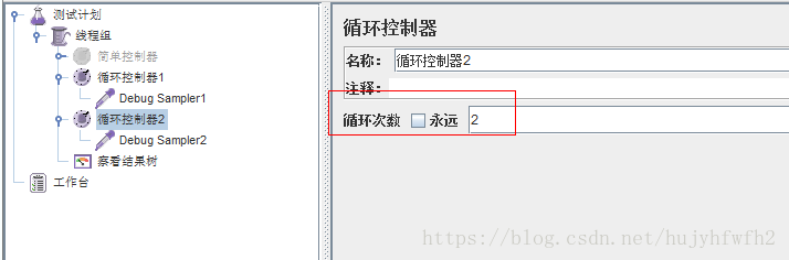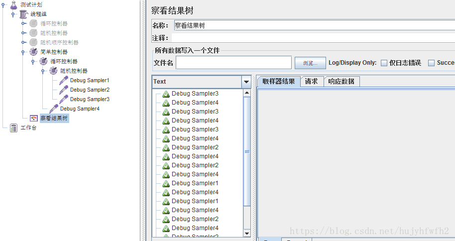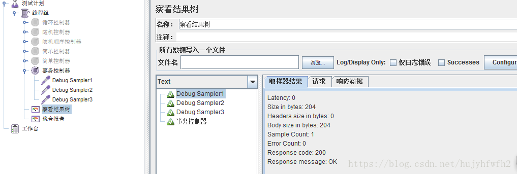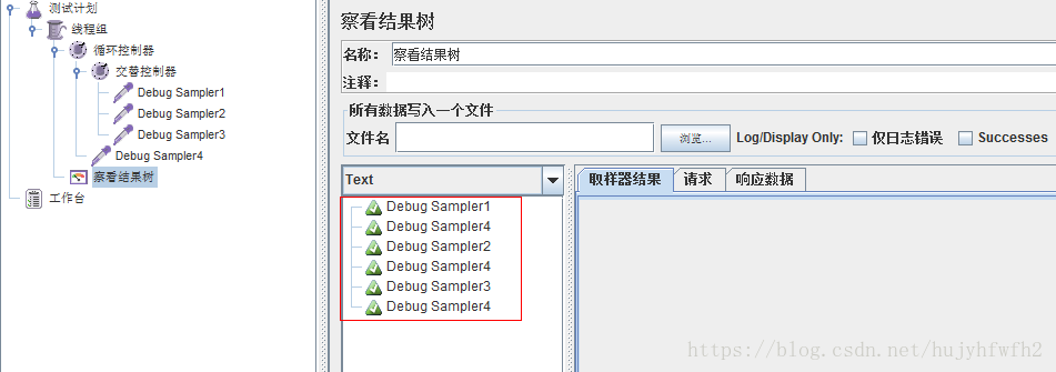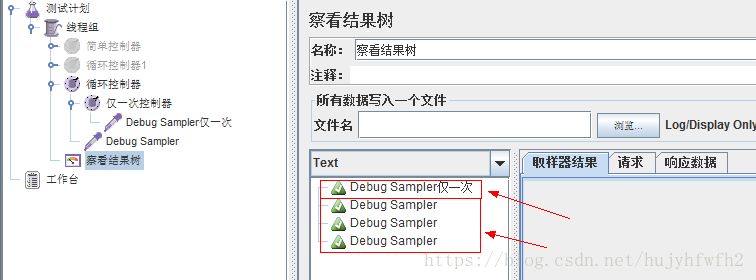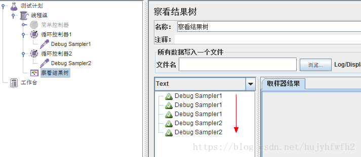 2.2:查看结果树发现他的运行书序是先运行3次debug sampler1然后在运行2次debug sampler2