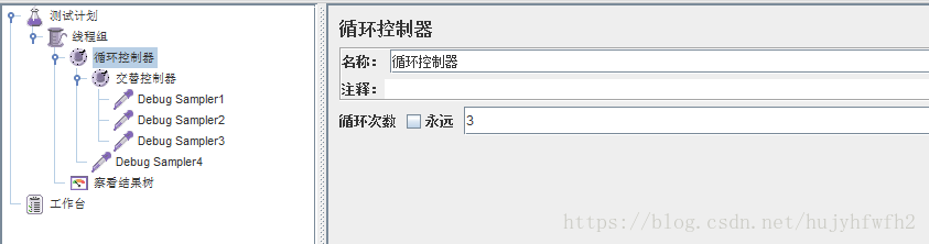 如下图交替控制器中添加3个sampler 循环控制器下添加一个交替控制器和一个sampler 并设置循环次数为3次