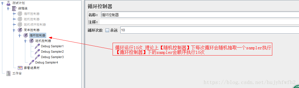 7.1:【循环控制器】下有一个sampler和一个[随机控制器];所以运行时【随机控制器】和【Debug Sampler】会顺序运行10次 只是每次【随机控制器】下的sampler会随机抽出来一个运行