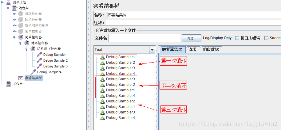 7.2:查看结果树【随机控制器】中的sampler每循环一次随机运行一个 【循环控制器】下的sampler会跟随【随机控制器】中的sampler顺序执行