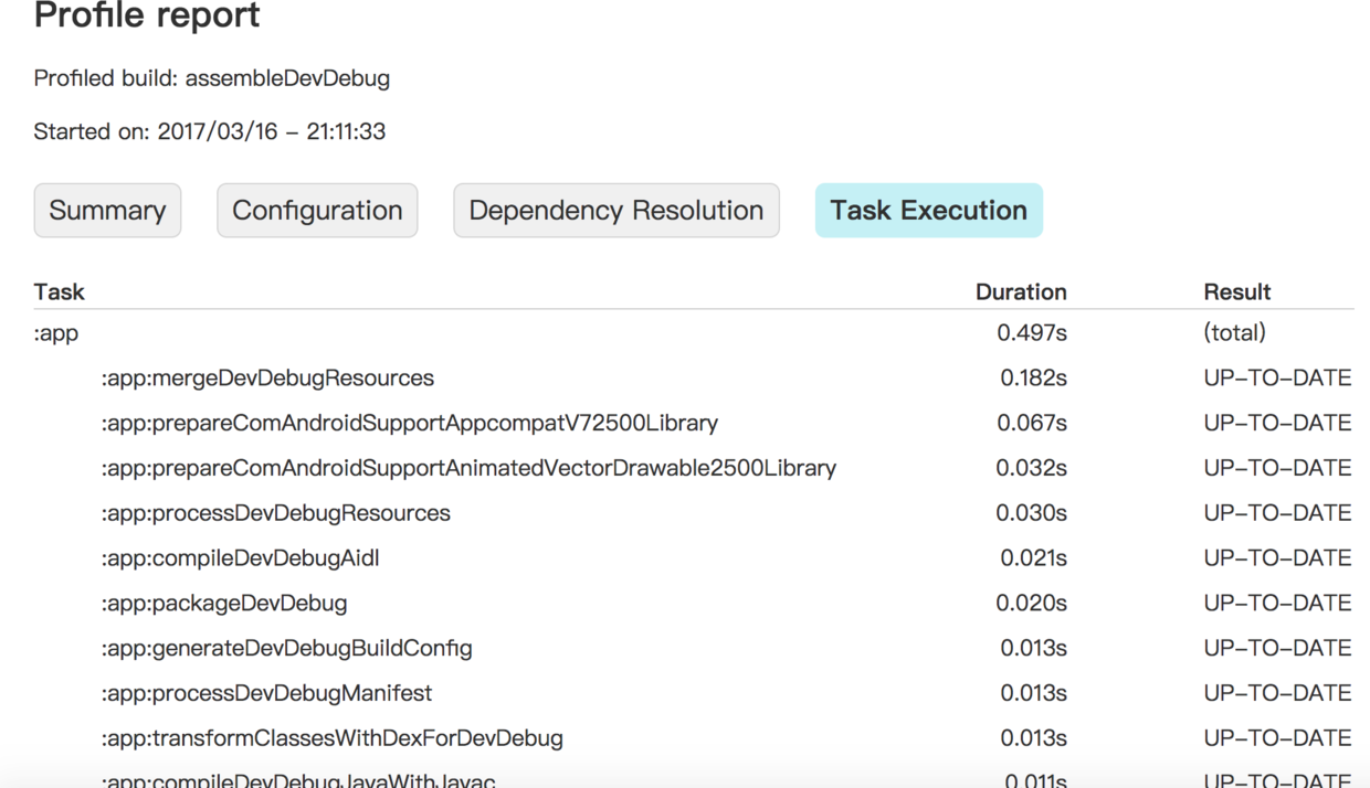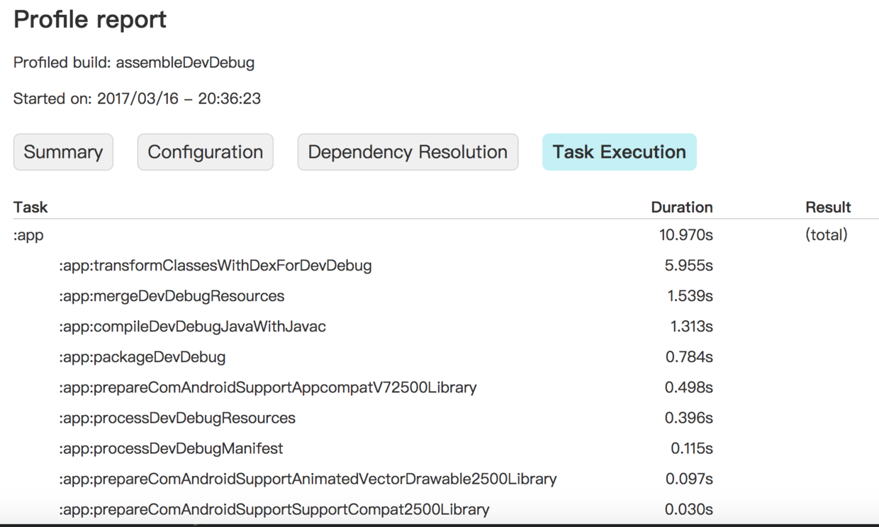 在大型的项目中(或者实现了大量自定义构建逻辑),可能需要更加深入的了解构建进程来寻找瓶颈,你可以通过分析构建生命周期的各个阶段 每个gradle task 执行了多长时间。例如:如果你的构建资料显示Gradle 花了大量的时间来配置你的工程,这建议你需要将自定义构建逻辑放在配置阶段之外。另外,如果mergeDevDebugResources 任务 消费了大量的的构建时间,这表明你需要将图片转换为WebP格式或者禁止PNG Crunching(第11,12 条优化建议)