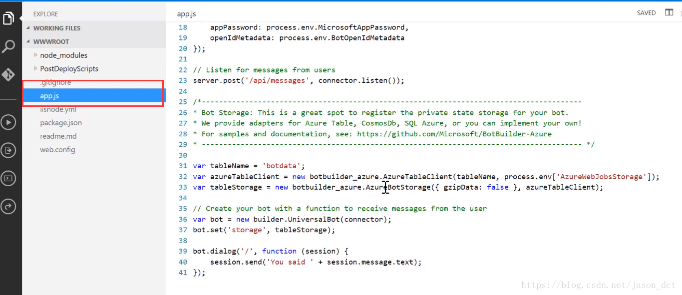 这里是Bot app.js 参考代码,仅为程序员提供参考,管理者请忽略。详细内容可以在Bot Server 里参看。