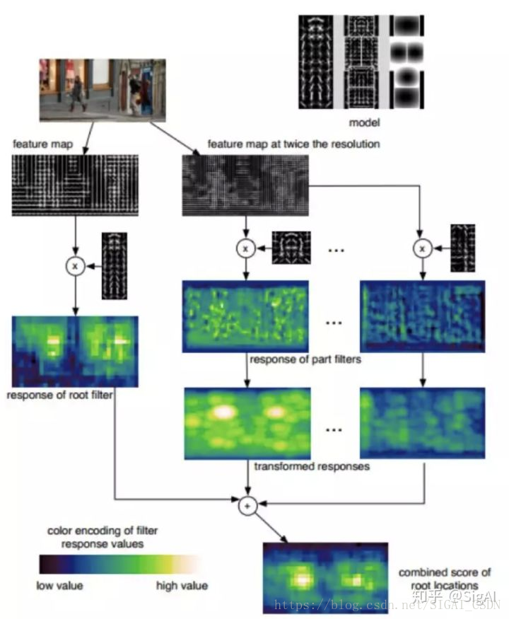 在深度卷积神经网络(DCNN)出现之前,DPM算法一直是目标检测领域最优秀的算法,它的基本思想是先提取DPM人工特征(如下图所示),再用latentSVM分类。这种特征提取方式存在明显的局限性,首先,DPM特征计算复杂,计算速度慢;其次,人工特征对于旋转、拉伸、视角变化的物体检测效果差。这些弊端很大程度上限制了算法的应用场景。