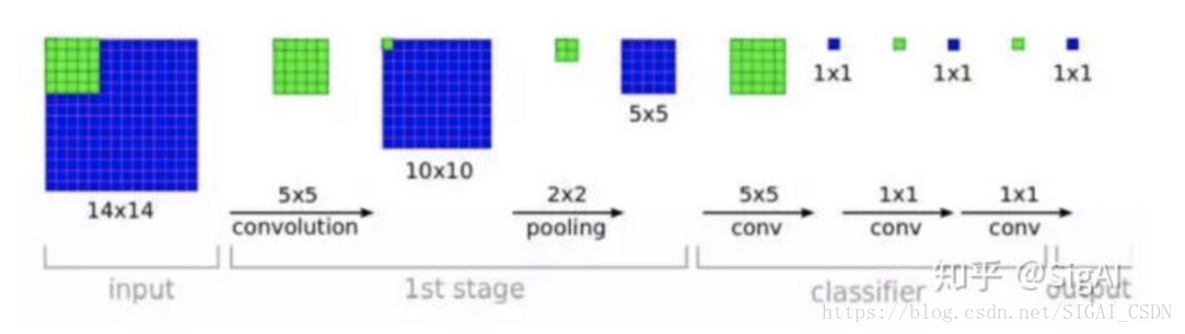 FCN并不是把5×5的图片展平成一维向量再进行计算,而是直接采用5×5的卷积核对一整张图片进行卷积运算。比如16×16大小的特征图片,那么会是什么样的结果?请看下面的示意图: