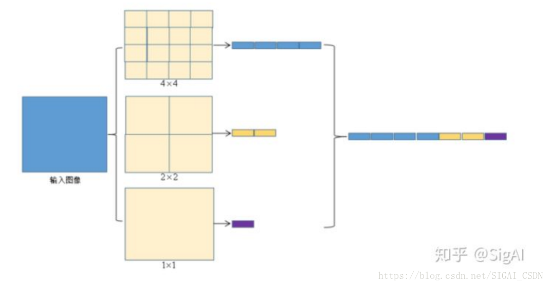 SPPNet引入了Spatial Pyramid pooling层,对卷积特征图像进行空间金字塔采样获得固定长度的输出,可对特征层任意长宽比和尺度区域进行特征提取。具体做法是对特征图像区域进行固定数量的网格划分,对不同宽高的图像,每个网格的高度和宽度是不规定的,对划分的每个网格进行池化,这样就可以得到固定长度的输出。下图是SPP操作示意图: