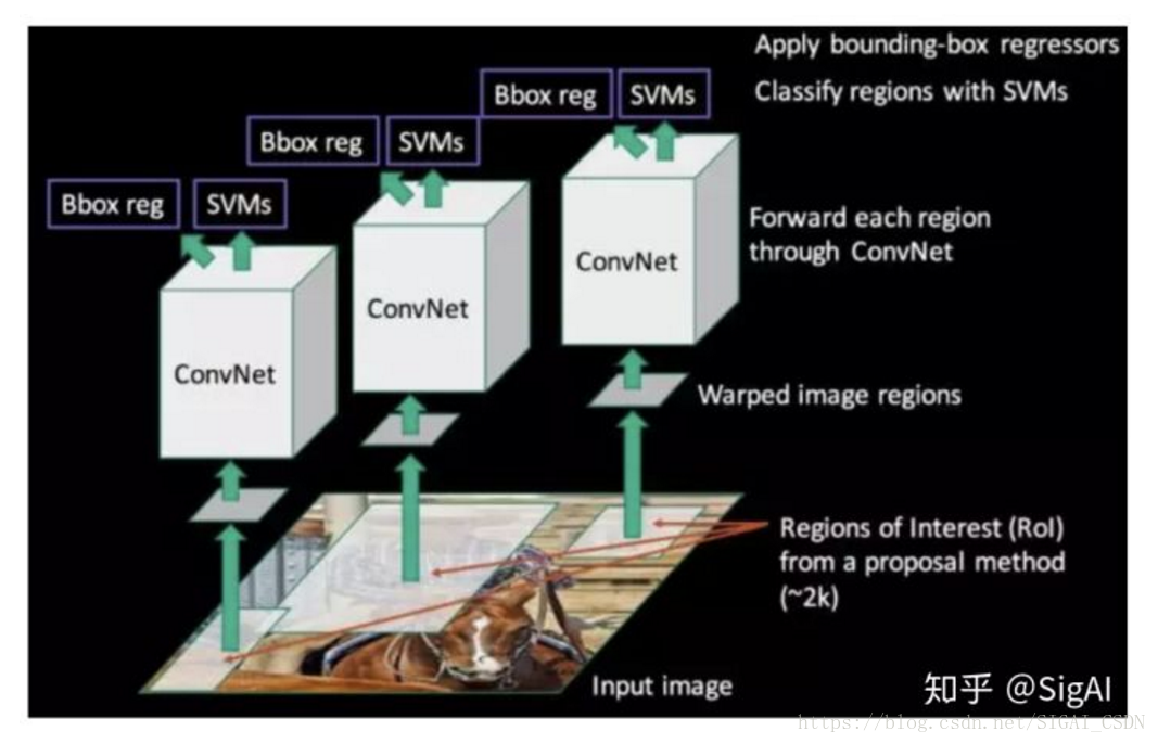 R-CNN不采用滑动窗口方案的原因一是计算成本高,会产生大量的待分类窗口;另外不同类型目标的矩形框有不同的宽高比,无法使用统一尺寸的窗口对图像进行扫描。用于提取特征的卷积网络有5个卷积层和2个全连接层,其输入是固定大小的RGB图像,输出为4096维特征向量。对候选区域的分类采用线性支持向量机,对每一张待检测图像计算所有候选区域的特征向量,送入支持向量机中进行分类;同时送入全连接网络进行坐标位置回归。