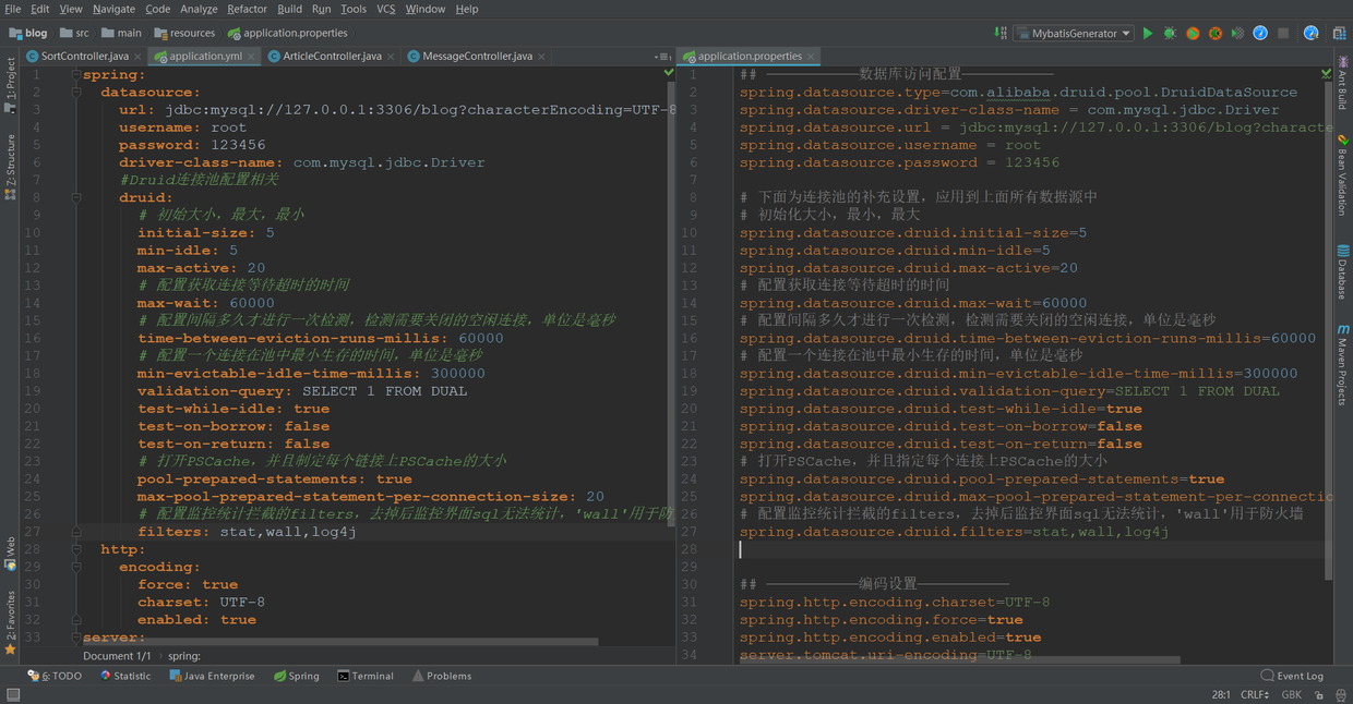 随着配置内容的增多,我逐渐的想要放弃.yml的配置文件,主要的一点是这东西不好对内容进行分类(下图是简单配置了一些基本文件后的.yml和.properties文件的对比)..