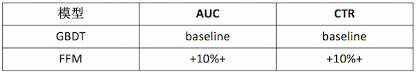 从GBDT模型切到FFM模型,积累的效果如下所示,主要的提升来源于对大规模离散特征的刻画及使用更充分的训练数据: