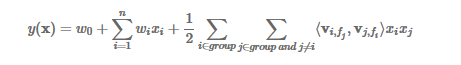 在使用DNN模型之前,搜索广告CTR预估使用了FFM模型,FFM模型中引入field概念,把( n )个特征归属到( f )个field里,得到( nf)个隐向量的二次项,拟合公式如下: