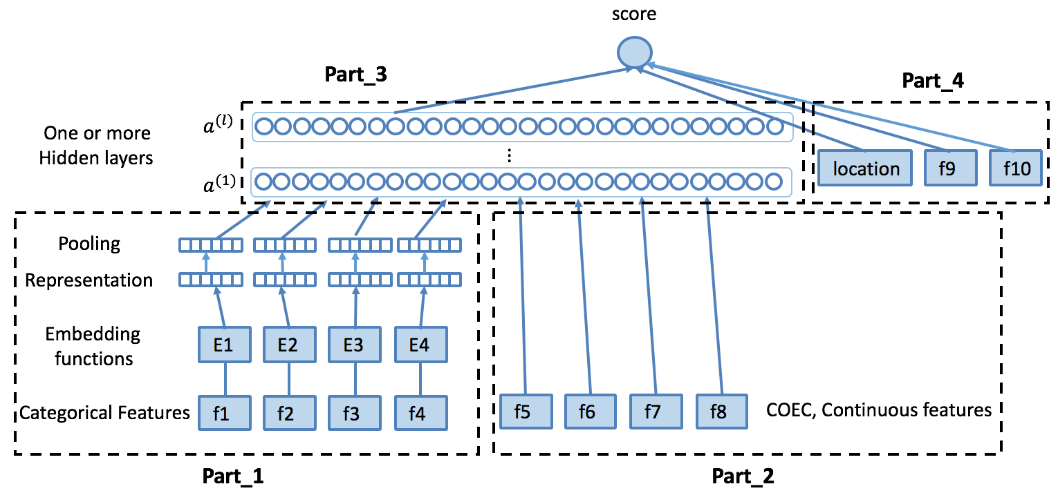 右侧的Part_2部分主要包含我们场景下的统计类特征及部分其他途径建模表示后输入的特征 (例如图片特征、文本特征等),和Part_1的最后一层拼接在一起做信息融合。