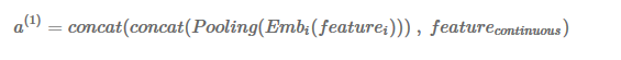 在搜索广告的场景中,上图的Part_1包含离散型特征及部分连续型特征离散化后的结果 (例如用户ID、广告ID、商圈ID、品类ID、GEO、各种统计类特征离散化结果等等)。离散化方式主要采用等频划分或MDLP[7]。每个域构建自己的embedding向量 (缺失特征和按照一定阈值过滤后的低频特征在这里统一视作Rare特征),得到特征的Representation,然后通过Pooling层做采样,并拼接在一起进行信息融合。