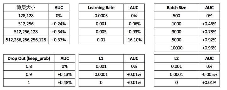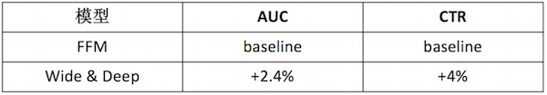 从FFM模型切到Wide & Deep模型,积累到目前的效果如下所示,主要的提升来源于模型的非线性表达及对更多特征的更充分刻画。