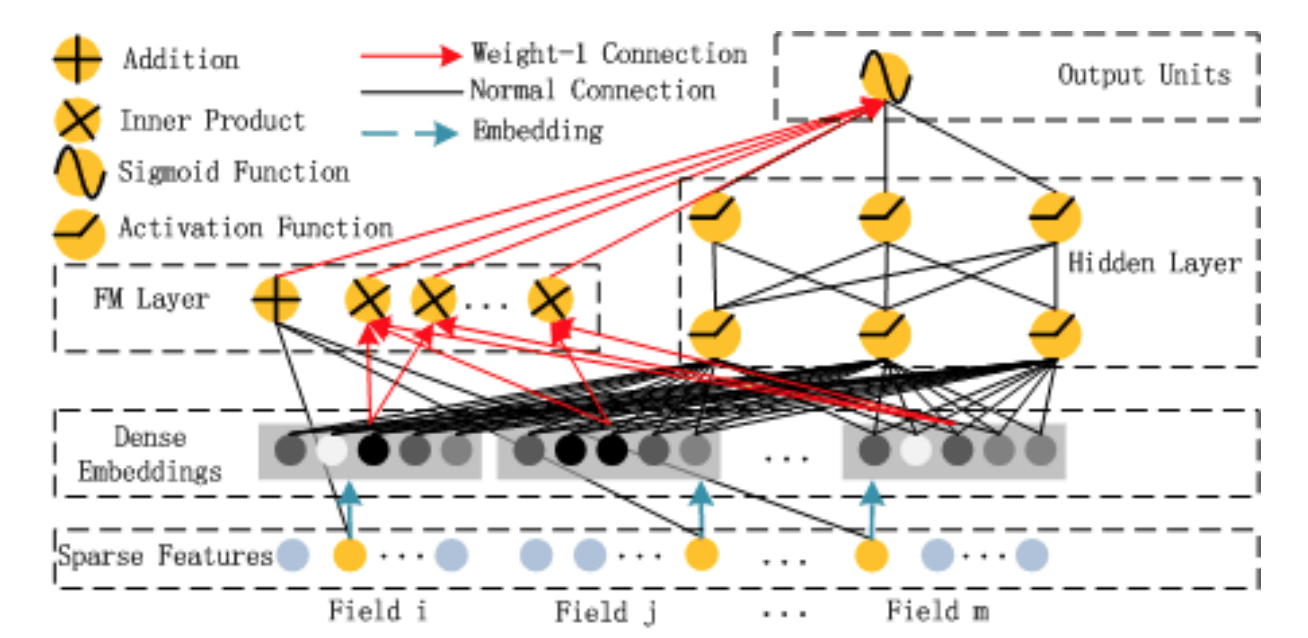 华为诺亚方舟团队结合FM相比LR的特征交叉的功能,将Wide & Deep部分的LR部分替换成FM来避免人工特征工程,于是有了DeepFM[8],网络结构如下图所示。