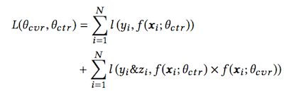 近期,阿里发表论文“Entire Space Multi-Task Model”[9],提出目前CVR预估主要存在Sample Selection Bias(SSB)和Data Sparsity(DS)两个问题,并提出在全局空间建模(以pCTCVR和pCTR来优化CVR)和特征Transform的方法来解决。具体的Loss Function是: