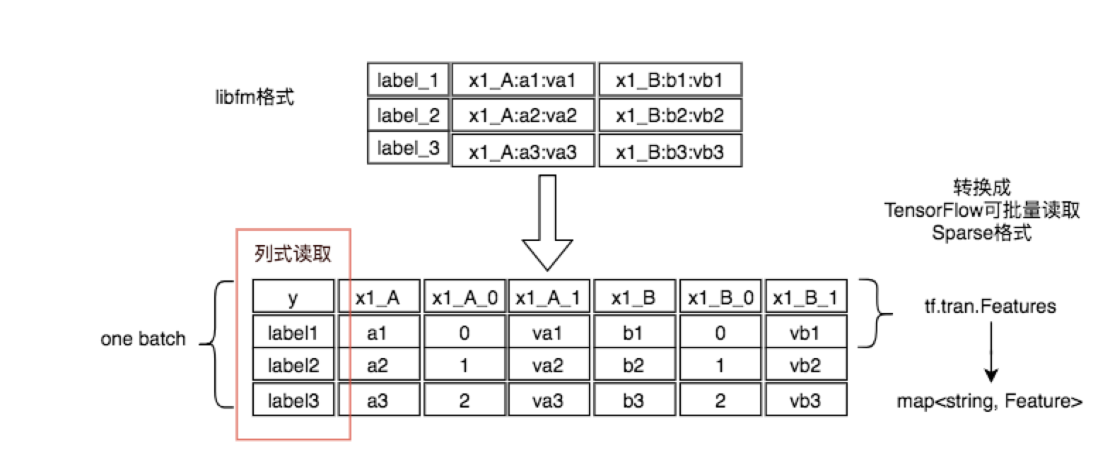 将libfm格式的数据转为易于TensorFlow操作的SparseTensor方式: