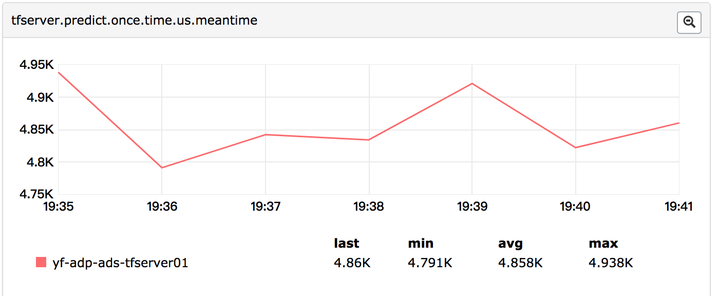 TF Serving服务端的性能差强人意。在典型的五层网络(512*256*256*256*128)下,单个广告的预估时延约4800μs,具体见下图: